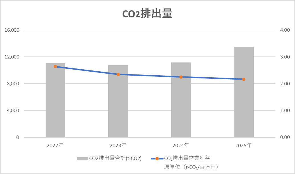 | CO₂排出量合計(t-CO₂) | 11,032 | 10,736 | 11,181 | 13,504 | CO2排出量 (Scope1、2)を 2023年比で 30%の削減 |