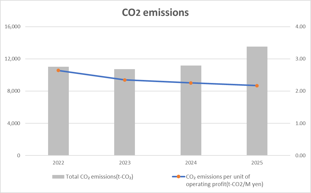 | Total CO₂ emissions(t-CO₂) | 11,032 | 10,736 | 11,181 | 13,504 | Reduce CO2 emissions (Scope 1, 2) by 30% compared to 2023 |