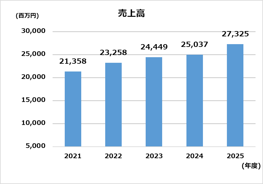 | 売上高(百万円) | 21,358 | 23,258 | 24,449 | 25,037 | 27,325 |