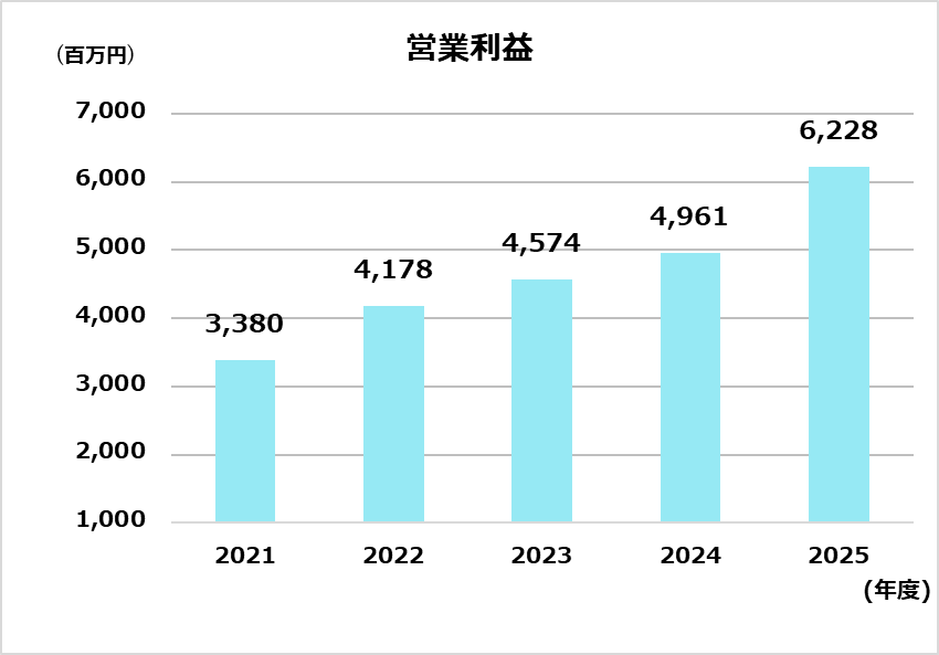 | 営業利益(百万円) | 3,380 | 4,178 | 4,574 | 4,961 | 6,228 |
