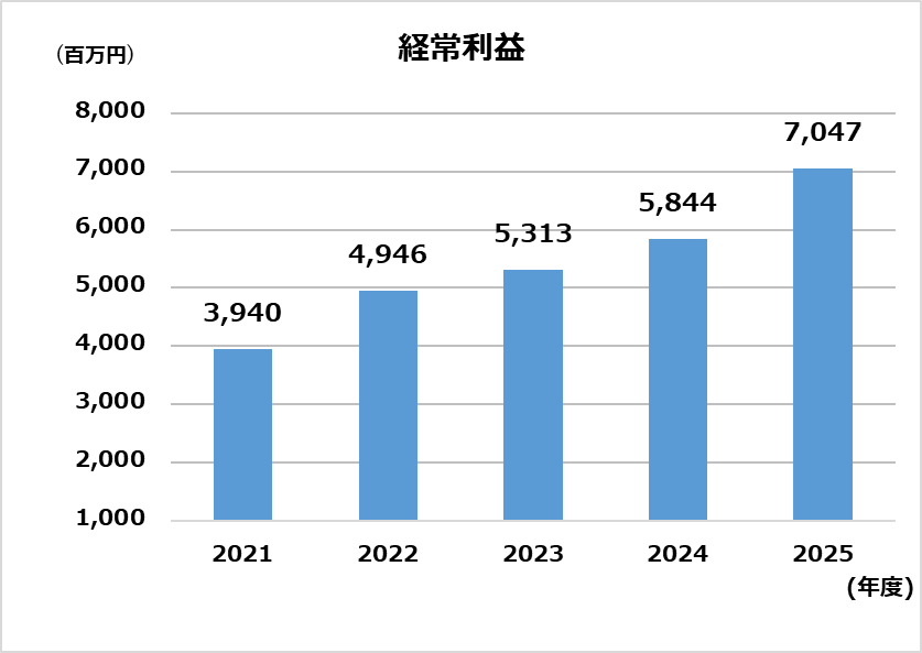 | 経常利益(百万円) | 3,940 | 4,946 | 5,313 | 5,844 | 7,047 |