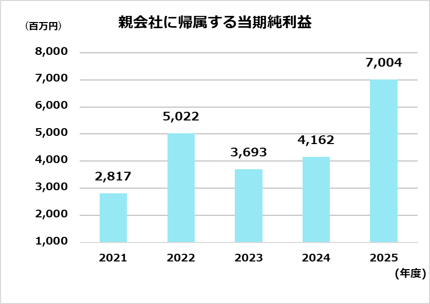 | 親会社に帰属する当期純利益(百万円) | 2,817 | 5,022 | 3,693 | 4,162 | 7,004 |