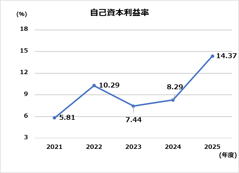 | 自己資本利益率(%) | 5.81 | 10.29 | 7.44 | 8.29 | 14.37 |